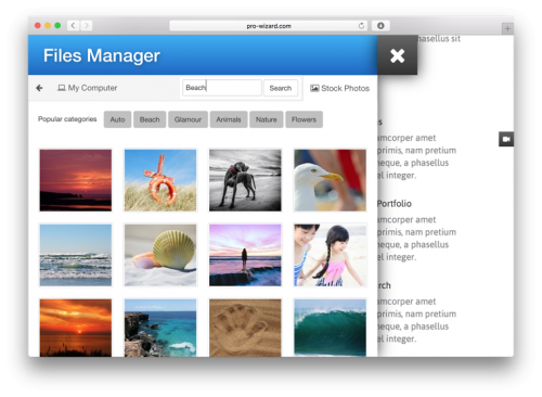 Carga fácilmente tus propios archivos desde tu computadora o accede a más de 500.000 fotografías profesionales de forma gratuita con un solo cliente, directamente en tu Administrador de archivos.